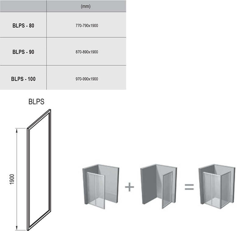Výrobok tvorí jeden pevný diel. Montuje sa do obloženého rohu kúpeľne (v kombinácii so sprchovými dverami BLDP2) na vaničky Ravak Perseus Pro, Perseus Pro Chrome, Gigant Pro, Gigant Pro Flat, Gigant Pro Chrome alebo priamo na podlahu so zabudovaným odtokovým žľabom či podlahovou vpustou. Pevná stena nie je určená na samostatné použitie. Kombináciou sprchových dverí s dvoma pevnými stenami typu BLPS vytvoríte sprchovací kút v tvare „U“. Použitím nastavovacieho profilu BLNPS je možné výrobok rozšíriť o 20 mm.